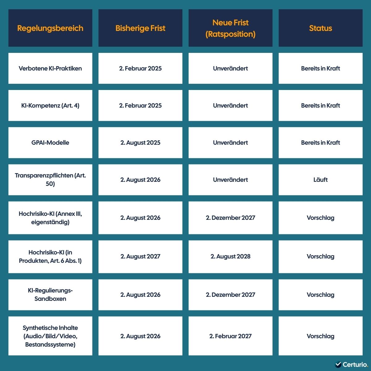Was als Nächstes? Führen Sie eine Gap-Analyse durch: Welche AI-Act-Pflichten gelten für Ihr Unternehmen bereits heute, welche ab August 2026, welche voraussichtlich erst 2027/2028? Die EU AI Act Schulung von Certurio enthält Checklisten und Blueprints, die genau diese Differenzierung unterstützen.