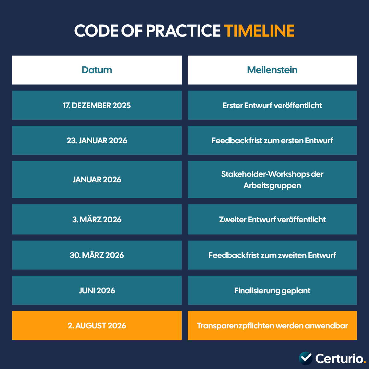 Dieser Artikel wurde von Certurio erstellt und basiert auf dem Verordnungstext der KI-Verordnung (EU) 2024/1689, dem zweiten Entwurf des Code of Practice on Marking and Labelling of AI-Generated Content (veröffentlicht am 3. März 2026 durch die Europäische Kommission), der Ratsposition zum Digital Omnibus vom 13. März 2026 sowie Analysen unabhängiger Kanzleien und Fachportale. Certurio ist Anbieter von KI-Compliance-Schulungen und -Materialien. Dieser Artikel stellt keine Rechtsberatung dar. Bei konkreten Compliance-Fragen sollten Sie qualifizierten Rechtsrat einholen.