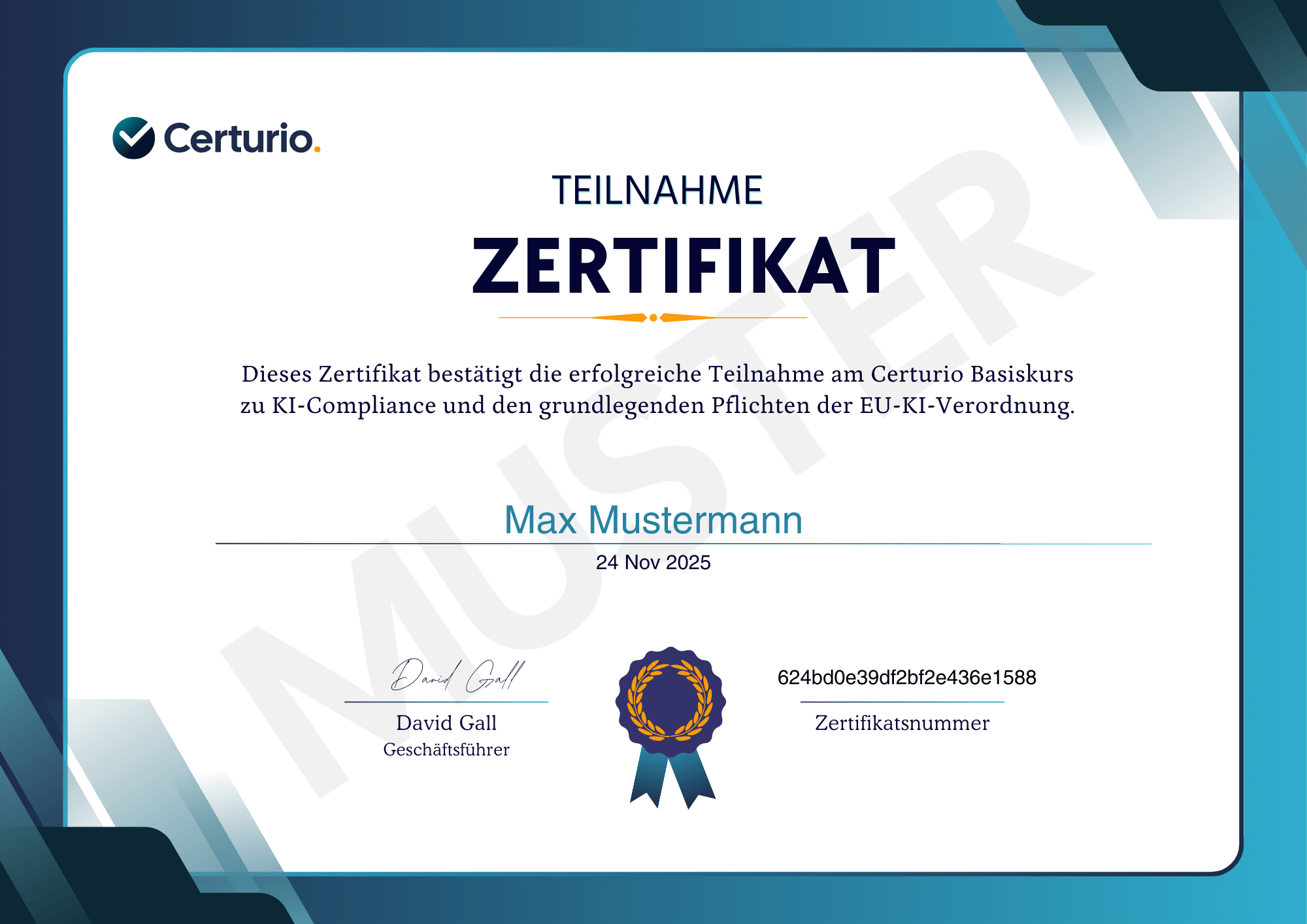 Nach erfolgreichem Abschluss erhalten Sie ein Teilnahmezertifikat, das als Nachweis Ihrer Schulung dient. Dieses Zertifikat kann bei prüfenden Instanzen vorgelegt werden, um die Erfüllung der gesetzlichen Anforderungen des EU AI Act und die Umsetzung der KI-Compliance im Unternehmen zu dokumentieren. Das Zertifikat ist ein wichtiger Bestandteil der Konformitätsbewertung und unterstützt Sie dabei, Audit-Vorgaben und Compliance-Nachweise gegenüber Behörden oder internen Prüfern zu erfüllen. -